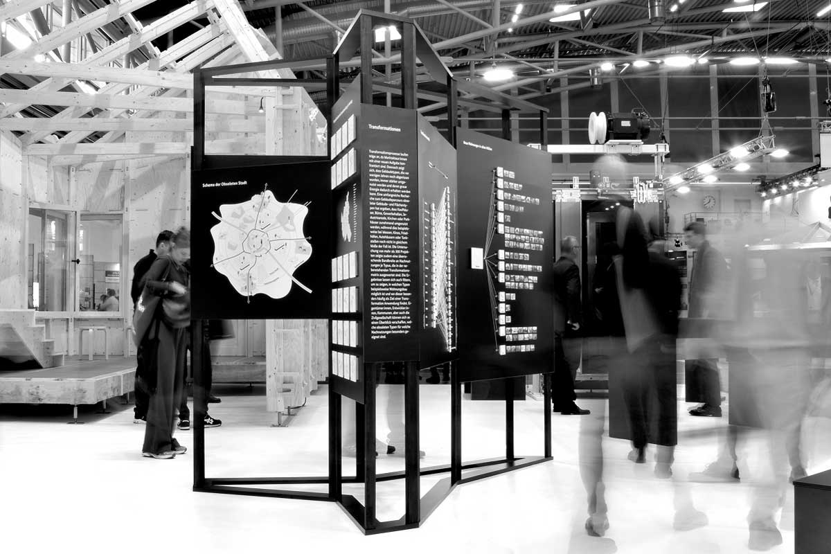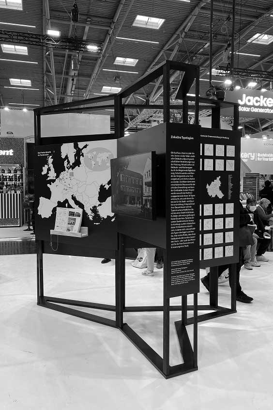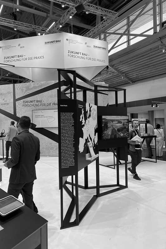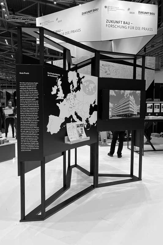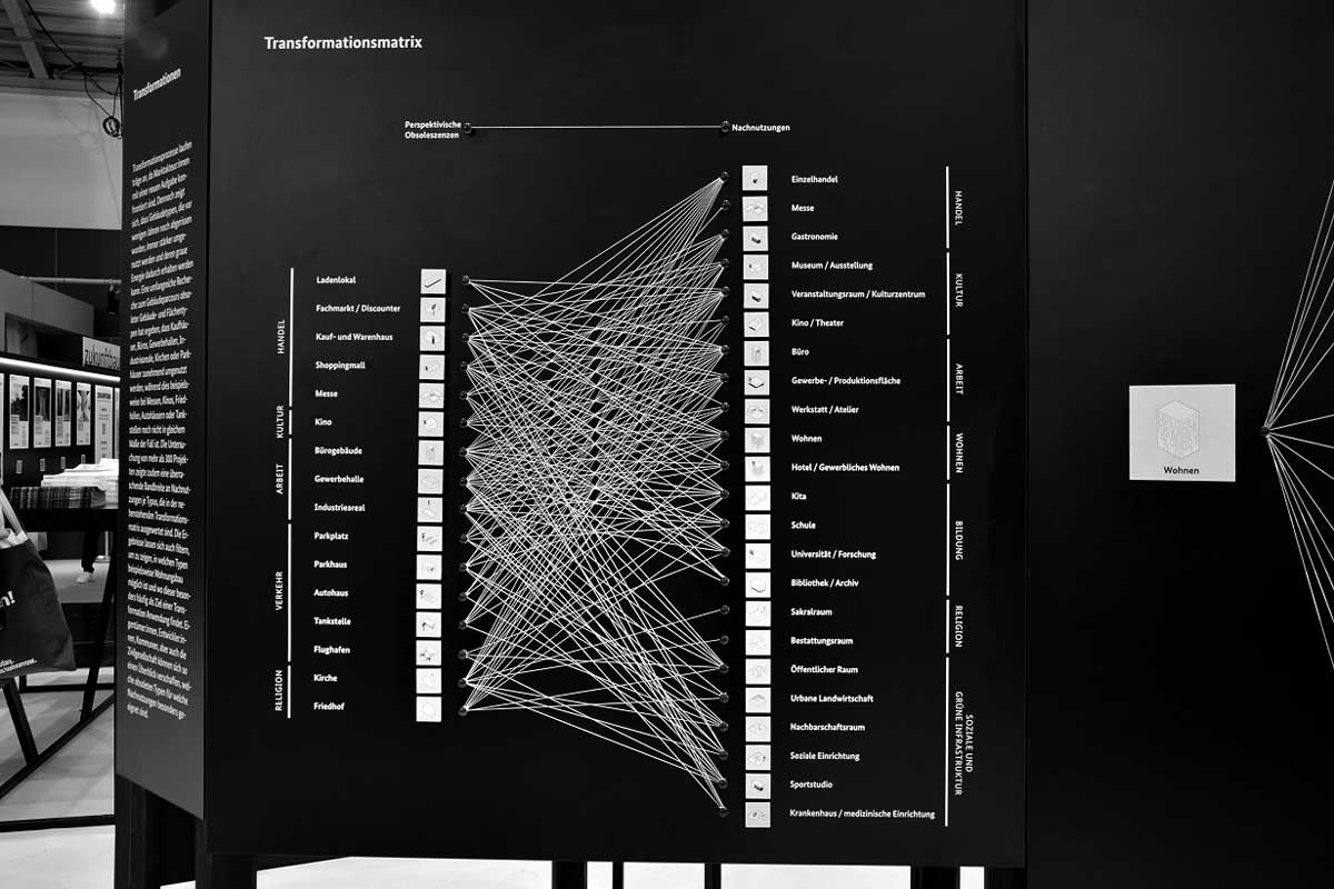Für die Vermittlung des großen Potenzials obsoleter Gebäudetypen wurde eine einfach verständliche Ausstellung konzipiert. Die sechs Tafeln bieten einen Überblick, wo sich obsolete Typen in den Städten befinden, welche Nachnutzungen in ihnen möglich sind – insbesondere, welche Typen sich für das Wohnen eignen. Zudem werden 80 hervorragende Beispiele vorgestellt, die Lust auf Umbau machen. Bislang wurde die Ausstellung auf der BAU München gezeigt sowie im Mai dieses Jahres im ehemaligen Bundestag von Günther Behnisch in Bonn – zum Zukunft Bau Kongress 2025. Die Ausstellung ist als kompaktes, einfach auf- und abbaubares Exponat entwickelt und kann bei Interesse ausgeliehen werden.